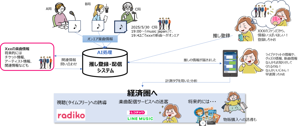 リスナーの登録する推し情報をもとに、AIが、推しの出演するラジオ番組を自動で探査しお知らせしたり、放送後の聞き逃し聴取に自動で送客する仕組みを実現し、リスナーがラジオを介してアーティスト情報に効率的に接触する機会の拡大を図る実証を実施しました。